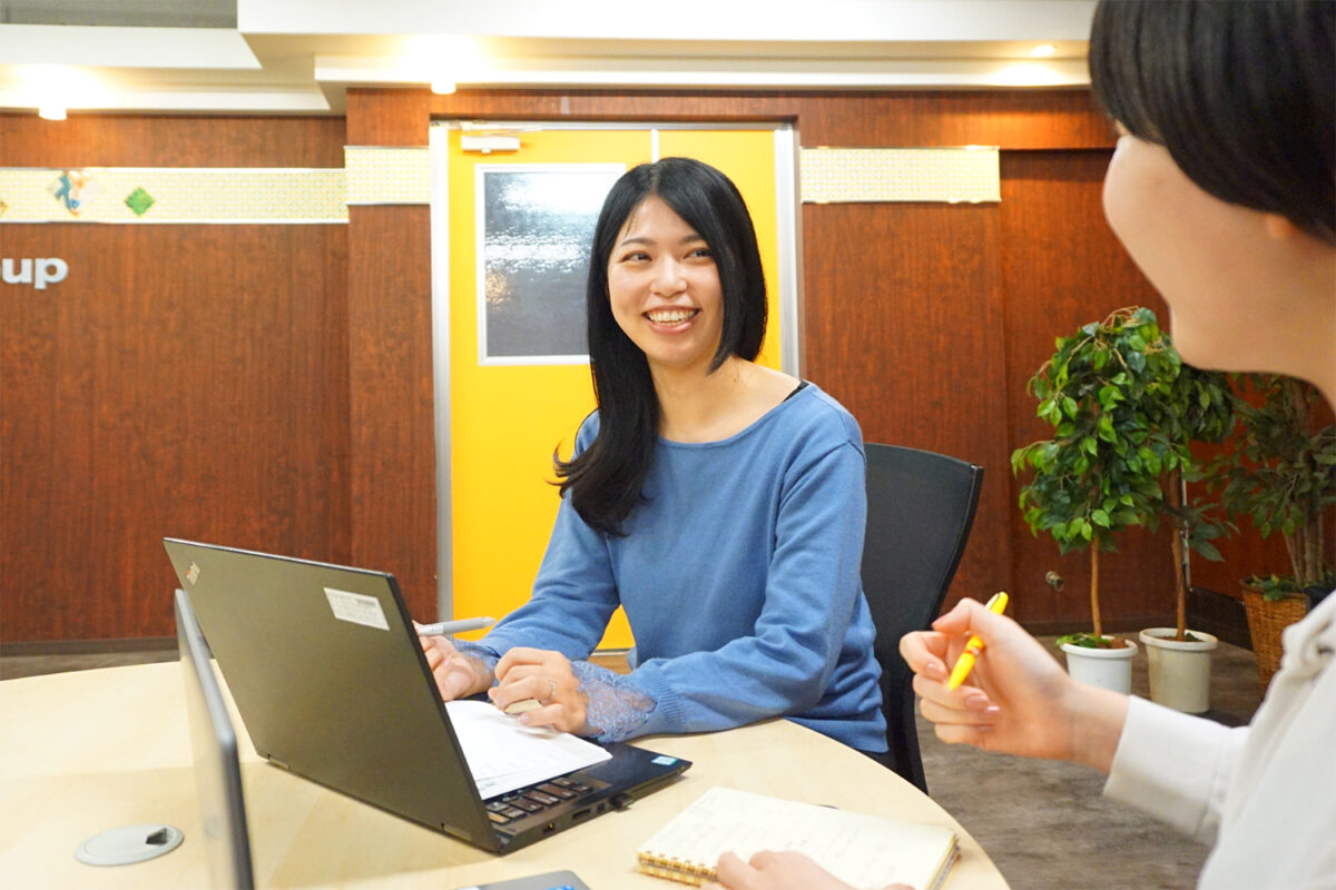 業務打ち合わせの風景です。時短勤務制度利用中の為、勤務時間は短いですが、その分しっかりと打ち合わせをし、効率の良い仕事を心がけています。